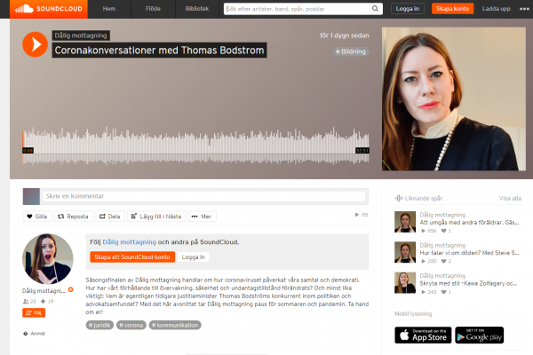 Publicerat den 9 juni, 2020I det här avsnittet av podcasten ”Dålig mottagning” får vi höra Thomas Bodström och Sonja Schwarzenberger diskutera hur lagstiftningen och vår inställning till samhället påverkas av Corona-pandemin. Klicka på länken för att lyssna! https://soundcloud.com/user-378540944/coronakonversationer-med-thomas-bodstrom